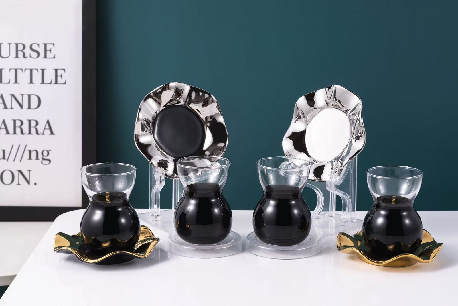Transform your dining experience with our elegant black tea glasses and chic black with silver, white with silver plates set. Perfect for those who appreciate modern design and timeless sophistication, this tableware seamlessly blends bold aesthetics with functionality. Whether hosting an afternoon tea session or a formal dinner, this set delivers a refined touch to any occasion while enhancing your presentation.